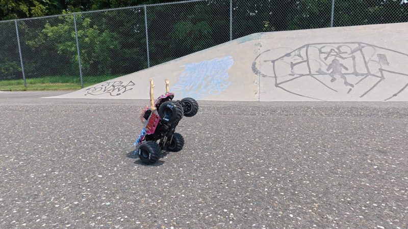 In dirt, the Zombie truly shines—kicking up roost, carving turns, and handling rough terrain with confidence. The open differentials make steering sharp and precise, but they can also cause a bit of “diffing out” under power when trying to recover from a crash. Durability-wise, the flexible arms and detailed body hold up far better than expected, even after hard tumbles. Whether indoors, outdoors, or at your local skatepark, the Zombie is an absolute blast to drive, proving itself versatile, fun, and true to its Monster Jam roots.