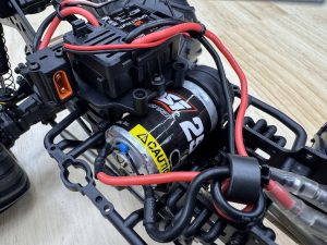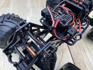 Losi stuck with proven components for the Zombie’s electronics. Steering is handled by a Spektrum SX108 servo with a built-in servo saver to protect against hard bashes. Power comes from a 2-in-1 ESC/receiver combo unit, which simplifies setup but limits future brushless upgrade options. The included 25-turn brushed motor paired with the 810mAh battery provides plenty of punch for wheelies, donuts, and even some backflip attempts. For those seeking more, brushless upgrades are possible, but out of the box, this setup is reliable and fun.