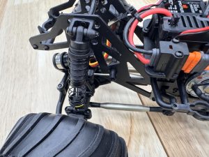 Losi equipped the Mini LMT Zombie with composite shocks that deliver surprisingly smooth performance. The truck features different spring rates front and rear for factory-tuned balance, while sway bars on all four corners help manage body roll during sharp turns and big jumps. Heavy-duty links under the chassis improve durability and rigidity, while aluminum option parts are available if you want to upgrade further.