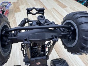 At the heart of the Mini LMT Zombie is a center-mounted transmission with all-metal gears and a durable spool. Power transfers through slider driveshafts with metal yokes to solid front and rear axles. The axles house open differentials, which improve turning radius but can sometimes make it harder to recover from a crash when you throttle out. Despite this, the drivetrain is built tough with ball bearings throughout and universal joints at the steering knuckles for smooth, durable performance.