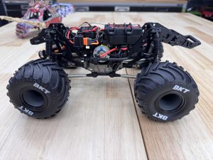 The Zombie uses the same twin vertical plate aluminum chassis design as the Megalodon, offering plenty of rigidity and bracing to handle flips, crashes, and rough landings. The battery mounts up top with secure O-ring straps, making swaps quick and simple. A wheelie bar is mounted at the rear, ready for stunts straight out of the box. Overall, the chassis layout is compact but mirrors the design of Losi’s larger LMT platform.